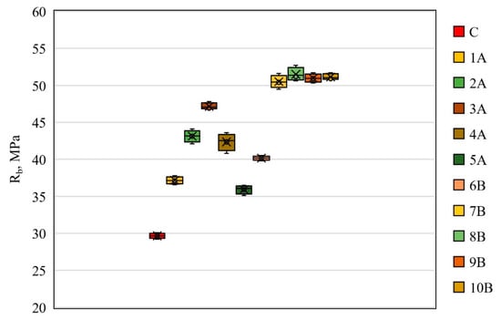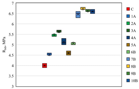 As shown in Figure 8, the maximum tensile strength of 6.7 MPa in bending was observed similarly to the compressive strength of the 8B composition, and the geopolymer composite of the control composition had the lowest bending tensile strength of 4.0 MPa. In general, the pattern of changes in tensile strength in bending is the same as for compressive strength. Therefore, for compositions of types 1A, 2A, 3A, 4A, and 5A, the tensile strength values in bending were 4.5 MPa, 5.5 MPa, 5.6 MPa, 5.1 MPa, and 4.6 MPa, respectively. Additionally, for compositions of types 6B, 7B, 9B, and 10B, the tensile strength values in bending were 5.1 MPa, 6.5 MPa, 6.6 MPa, and 6.6 MPa, respectively.