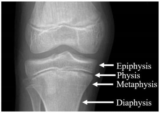 Concerning FEA, the epiphyseal plate was modeled by virtually cutting the bone into two parts, and growth was simulated by loading the bone in this plane. For a more realistic approach, the epiphyseal plate could be modeled as a 3D object bridging the epiphysis and metaphysis-diaphysis (see Figure 6), and the growth could be simulated by prescribing displacements to relevant nodes, which is still a simplification of reality, or a more complex mathematical model could be used to consider, e.g., rate of growth, as is presented in [17]. Nevertheless, this method would not be simply verifiable by an experimental approach as we cannot easily simulate the real growth. The growth simulation remains a challenge for future scientific research.