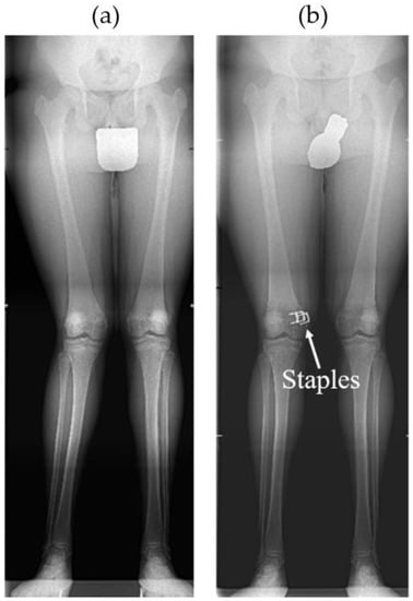 - Courvoisier, A.; Eid, A.; Merloz, P. Epiphyseal Stapling of the Proximal Tibia for Idiopathic Genu Valgum. J. Child Orthop. 2009, 3, 217–221. [Google Scholar] [CrossRef] [Green Version]