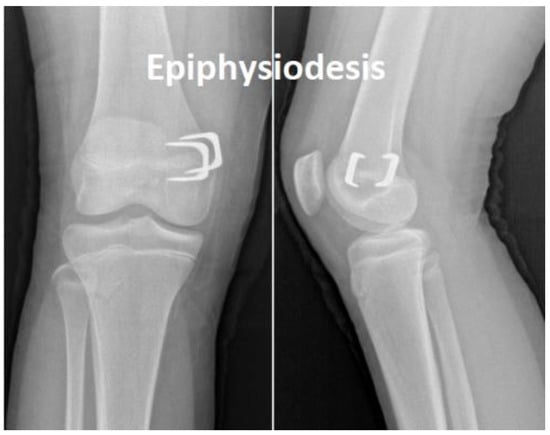 - Fillingham, Y.A.; Kogan, M. Chapter 21—Epiphysiodesis for Limb Length Discrepancy and Angular Deformity. In Book Case Competencies in Orthopaedic Surgery; Frank, R.M., Forsythe, B., Provencher, M.T., Eds.; Elsevier Inc.: Amsterdam, The Netherlands, 2017; pp. 195–207. ISBN 978-0-323-39038-5. [Google Scholar] [CrossRef]
