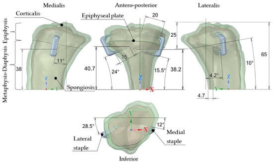In this paper, we used only the bone model and staples for FEA. The reason for this acceptable simplification lies in the fact that the limb growth is primarily determined by the bone (or, more accurately, epiphyseal plate). The bone is intact (i.e., without fracture); therefore, the influence of the muscles, ligaments, menisci, and synovia on bone growth is negligible compared to the load on the bone.