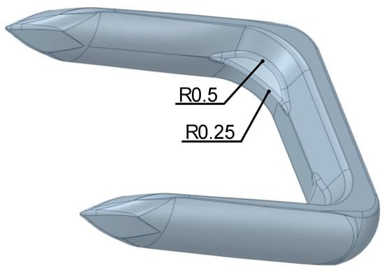 The CAD model of staple provided by MEDIN a.s. contains notches, which are not suitable for FEA. For this reason, sharp edges were rounded; see Figure 7. However, these sharp edges are important for properly inserting the staple in a bone.