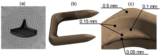 The presented mesh in its final form was used for the final calculation and result evaluation. The sensitivity analysis started with a coarse mesh, and after each computation, a new, refined, mesh with half the element size of the previous mesh was created. This process was repeated until results for two different meshes were close (within a 1% margin of error); in this way, the mesh sensitivity analysis was performed.