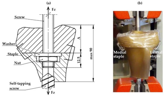 The experiment was conducted to support the FEA and clinical applications, i.e., to determine the maximum loading force Fz of the bone that the staples can withstand and to partially confirm the findings of the numerical analysis. However, as the experiments are not the main goal of this article (the main goal is FEA), they were performed only once on an anatomical artificial bone [26] and once using certified bone foam blocks [27] and will be only briefly described (see Section 4: Results of the Experiment).