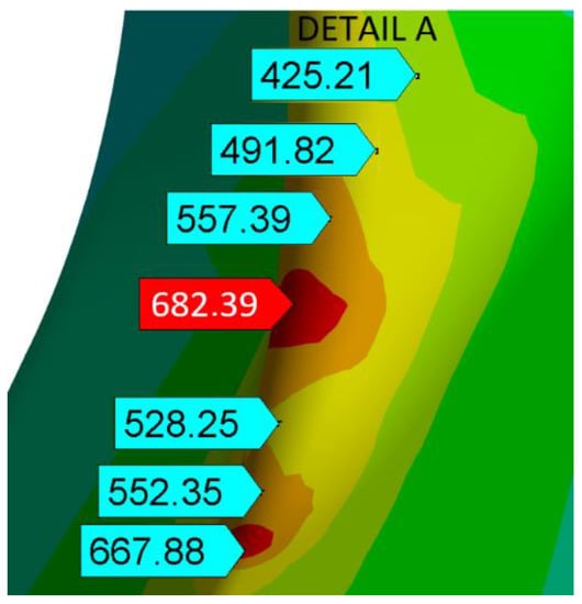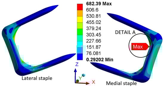 Detail “A” (see Figure 13) of the location with the maximum equivalent stress (von Mises) in the medial staple and with marked values near the maximum (MPa).