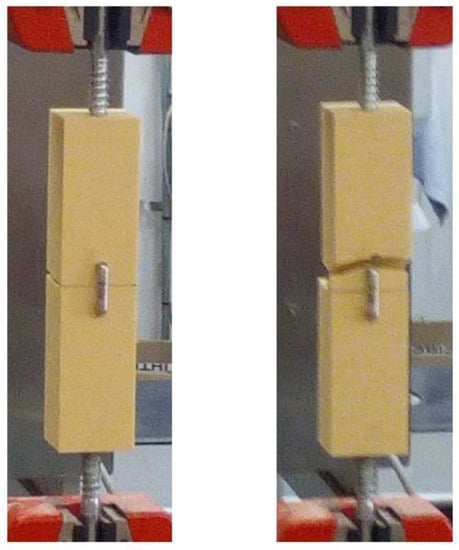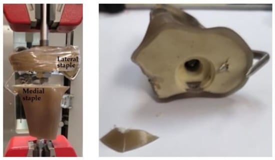 Apart from this experiment simulating a real-world application of Blount staples, additional experiments were performed using solid foam blocks with bone-like properties procured from SAWBONES; see [27]. The block was cut into smaller pieces to fit into our testing machine. Two pieces of the foam block were connected by a Blount staple and, as such, they were inserted into the testing machine using screws from the abovementioned jig and pulled apart. This experiment yielded similar results—the foam block always failed in the place of staple insertion, leaving the staples’ structural integrity intact (similarly to the experiment on the model of the tibia); see Figure 19.