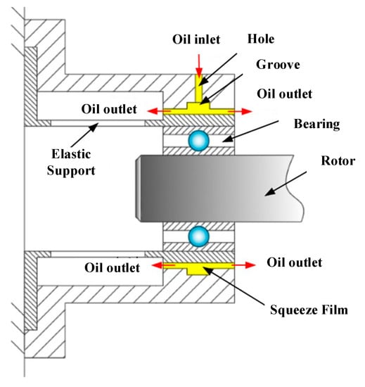 Squeeze Film Damper (SFD) is frequently used for the vibration reduction of rotor systems in aeroengines. The principle of vibration reduction is that the bearing outer ring is installed in the bearing seat with a certain clearance, which is introduced to lubricating oil to form squeeze oil film. The vibration load caused by the rotor approaching or passing the critical speed or by the unbalanced force is transmitted from the rotor to the elastic support through the bearing. Under the transverse load of the rotor, the journal produces radial displacement and the vibration energy then is absorbed by the lubricating oil. The typical installation method of SFD in a bearing is shown in Figure 1.