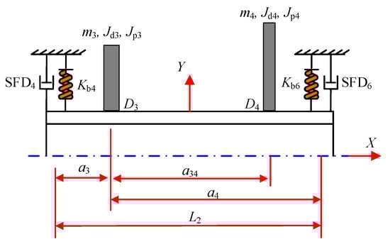 The equivalent disk D3 of the high-pressure compressor has the vibration of y3 (vertical) and z3 (horizontal), and the rotation angles are θy3 and θz3, respectively. The vibrations corresponding to the equivalent disk D4 are y4 (vertical), z4 (horizontal), θy4, θx4. The differential equation of motion of the high-pressure rotor system is as follows: