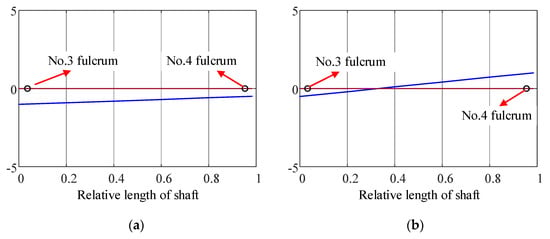 According to the established lumped mass model of the high-pressure rotor system, the first two order rigid body modes (translation and pitch) and the dynamic characteristics about the first order bending mode are obtained. The natural frequency ωn of the rotor can be obtained by solving the characteristic roots of Equations (6) and (7). The natural circular frequency ωn of the rotor will change with the rotational angular velocity Ω. The critical angular velocity is the rotational angular velocity equal to the preceding angular velocity. Therefore, the critical angular velocity of the rotor can be calculated according to Ω = ωn. The calculated first two order modes of the high-pressure rotor system are shown in Figure 4.
