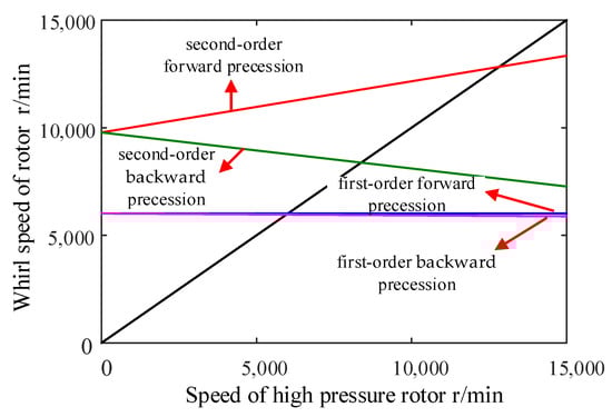 Calculating the modal frequency at different speeds from 0 to 15,000 rpm, the Campbell diagram of the high-pressure rotor is obtained in Figure 5. The intersection point of the line with slope 1 and other curves is the critical speed of the high-pressure rotor in reverse precession and forward precession, respectively.