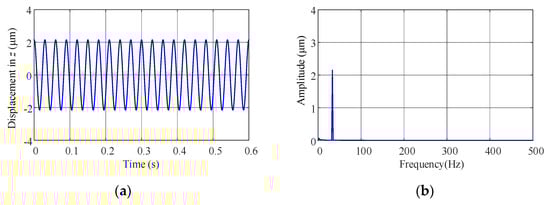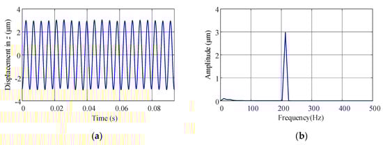 By contrast, under the condition of high speed and small imbalance, the vibration is also stable. For example, when the unbalanced mass me = 4 × 10−5 kg·m and the speed rn = 12,800 r/min, the vibration response is shown in Figure 13.