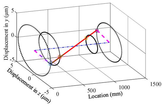 Under the condition of high speed and large unbalanced mass, such as rn = 12,800 r/min, which is higher than the second-order critical speed, me = 4 × 10−4 kg·m, the calculated rotor vibration response is shown in Figure 11.
