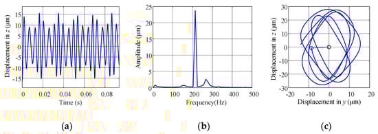 Vibration response under speed of rn = 12,800 r/min and unbalanced mass of me = 4 × 10−3 kg·m. (a) time domain response; (b) frequency domain response; (c) displacement.