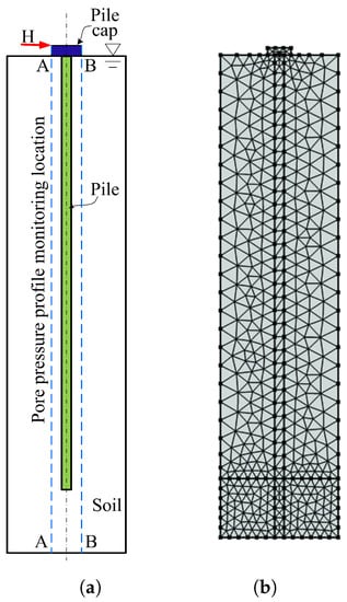 The pile–soil interaction of a capped pile in a completely saturated soil is studied here using an integrated multiphysics model. The study pile was 0.4 m wide by 18.0 m long and the pile cap was 1.0 m × 1.0 m × 0.3 m thick. A schematic layout of the study problem is shown in Figure 1a. To solve the solid mechanics governing equations, sufficient boundary conditions must be provided: the left and right boundaries of the model were constrained by roller support, the bottom boundary was constrained by fixed pinned, while the top boundary was left free. A pressure head of 20.5 m was assigned at the bottom boundary, representing a full height of ground water table, while the top boundary was set free for the Darcy’s water governing equation. The model is discretized into small triangular mesh, as shown in Figure 1b. As the simulation was executed in a coupled model consisting of the solid mechanics of the porous soil–structure interaction and the fluid motion, the mesh was generated for the above combined physics to produce a better-quality result. In the soil–structure interaction problem, Lagrange elements have been found to perform better than the serendipity elements. However, due to the extra internal nodes, for problems involving plastic yielding of soil, the Lagrange elements require the formulation of a larger matrix and, hence, more computational time and cost than that of the serendipity elements. Although the triangular serendipity element has fewer nodes per element, it often exhibits good accuracy for the same mesh compared to the Lagrange elements [20]. To tackle the bending problem of the pile structure, instead of the higher order elements, we use the quadratic triangular serendipity element with extra fine elements in the vicinity of the pile–soil boundary for smooth translation of degree of freedoms while fine mesh was provided for the zone away from the pile–soil boundary. The mesh consists of a total of 753 triangular elements with an average mesh quality, which was based on the skewness parameter, of 0.8. In general, only elements with a quality of less than 0.1 are considered as poor quality [20].