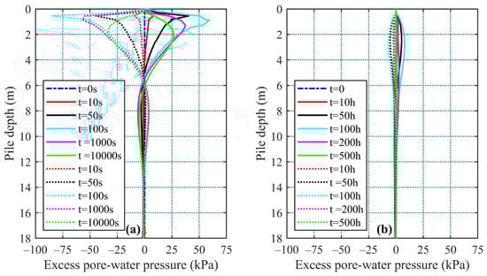In the fast and slow transient loading cases, the maximum positive and negative excess pore-water pressures were both observed at the end of the loading, at t = 100 s (Figure 2a) and at t = 100 h (Figure 2b), respectively. The maximum positive excess pore-water pressure computed at t = 100 s was 53.4 kPa, and then it decreased to 37.3 kPa and 26.8 kPa at t = 1000 s and 10,000 s, respectively. The suction at t = 100 s was (−)84.5 kPa, the suction decreased to (−)57.0 and (−)33.3 kPa at t = 1000 s and 10,000 s, respectively.