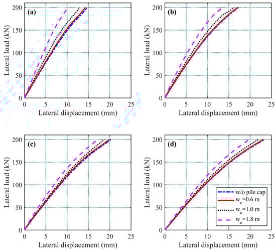 Effect of pile cap width on lateral displacement of pile cap: (a) undrained (loading rate = 2 kN/s); (b) partially drained (loading rate = 2 kN/h); (c) drained (loading rate = 2 kN/day); and (d) dry soil (loading rate = 2 kN/step).