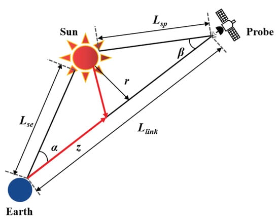 In order to analyze the impact of coronal plasma on optical links, the Figure 1 shows the geometric diagram for deep space communication during superior conjunction. Here, the distance between the Earth and the Sun is and the distance between the probe and the Sun is . Note that, z denotes the signal propagation distance, r is the distance between the Sun and the communication link, which is usually in units of the solar radius . Therefore, both the Sun–Earth–Probe (SEP) angle and the Sun–Probe–Earth (SPE) angle are directly related to r. According to the triangle relationship, the link distance can be written as: