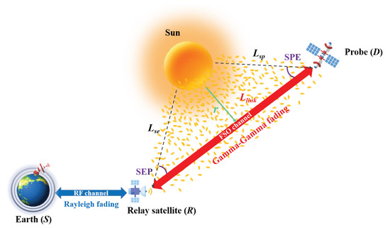 Figure 2 demonstrates the asymmetric-based RF/FSO deep space communication system during superior conjunction. We adopt the dual-hop relay communication technology, where relay satellites orbiting the Earth first receive signals from Earth stations through RF and then transmit them via FSO.