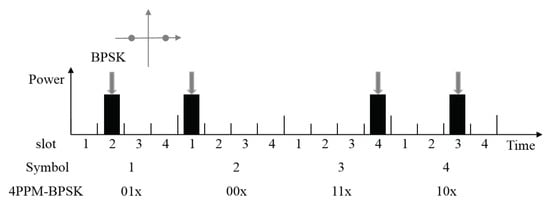 A hybrid PPM–BPSK–SIM modulation is a multi-dimensional modulation method that combines subcarrier modulation and pulse position modulation. Here, we introduce by a 4-PPM, which is displayed in Figure 3. For a 4-PPM modulation symbol, the number of slots is , and the data bits that can be transmitted in each frame . If the n-bit data are written as M, and the time slot position of the light pulse is recorded as l, M can have four combinations: , , , , and the corresponding time slot positions are , , , , respectively. As shown in Figure 3, the L-PPM–BPSK is to change the original position of energy in L-PPM from pure intensity modulation to BPSK modulation. Therefore, after the combination of PPM and BPSK, one bit of BPSK information is added to each frame, and the number of transmitted bits is increased, which improves the transmission efficiency.