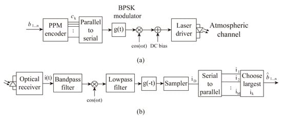 As present in Figure 4, the transmitter consists of an n-bit PPM encoder, a parallel serial converter and a transmitter filter with a rectangular pulse shape of duration. The PPM symbol is applied to the BPSK modulator on the radio frequency subcarrier. Before intensity modulation of the light source, a DC bias is added to the BPSK signal. Therefore, the modulated signal with L-PPM–BPSK–SIM is expressed as