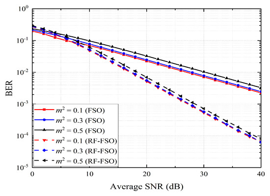 Average BER of 16-PPM–BPSK–SIM RF/FSO system and the FSO system against the average SNR under various scintillation indices and the pointing error parameter .