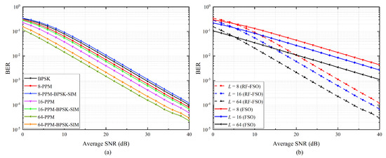 When , i.e., under weak scintillation (a) average BER of BPSK, L-PPM and L-PPM–BPSK–SIM against average SNR; (b) average BER of L-PPM–BPSK–SIM with various on the hybrid RF/FSO system and FSO system against the average SNR.