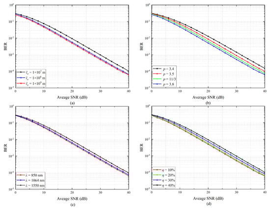 Figure 9 reveals the average BER performance of the hybrid RF/FSO system for optical wave propagation through coronal turbulence under various parameters. As shown in Figure 9a,b, the increasement of the turbulent outer scale and spectral index will lead to the reducement the average BER of the system. Moreover, when the values of and p are larger, their influence on the BER will attenuate, because the amplitude fluctuation variance is smaller. However, it is worth noting that compared with an FSO system in some other research studies [41], when the turbulence outer scale and spectral index increase, the BER of the system will change significantly. Consequently, hybrid systems and hybrid modulation will enhance the stability of the BER performance.