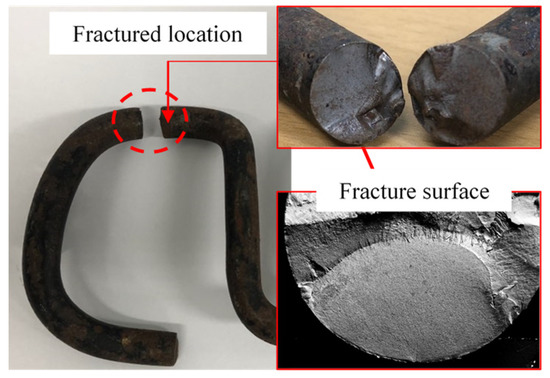 One year and five months after opening the urban railway in South Korea, 0.17% of the SKL15 tension clamps in the DFF-300 rail fastening system had been damaged. The SKL15 tension clamps were made from a spring steel, which had the minimum yield and tensile strengths of 1150 MPa and 1300 MPa, respectively [6]. As shown in Figure 2, the fracture surfaces of the damaged tension clamps showed the typical characteristics of a fatigue crack, which has an elliptical shape and a smooth surface. All of the cracked tension clamps were observed on the railroad with a curve radius (R) of 1200 m or less. Specifically, 79.1% of the damage occurred on the railroad with a curve radius of 800 m, and 94.5% of the cracked tension clamps were installed on the inner rail. The inner and outer rails can be divided into the inside and outside track gauges at the curved sections. Approximately 56% of the damage was found on the inside track gauge; Table 1 summarizes the statuses of the cracked tension clamps. Since the failure of the tension clamps is caused by fatigue, a fatigue reliability analysis was performed where most of the cracks occurred and the reasons for the tendency of fatigue cracks in the inner and outer rails were investigated.