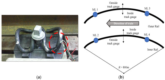 The statistical model for the stress range of the tension clamps was developed to estimate the fatigue reliability indexes using field measurement data. Figure 3a shows a rosette strain gauge attached to the top of the middle bend of a tension clamp and Figure 3b presents the four measurement locations (MLs) on the railway track. ML1 and ML3 were located on the outer rail of the railway track while ML2 and ML4 were positioned on the corresponding inner rail of the railway track. The field measurements were performed on both the inside and outside track gauges at the four MLs.