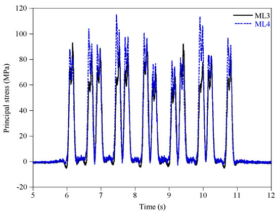where , , , and are the maximum and minimum principal stresses, the elastic modulus, and Poisson’s ratio, respectively, and , , and indicate the measured strains with the rosette strain gauge. As a representative case, the variations in the principal stresses for the outside track gauge at ML3 and ML4 during the train passage are illustrated in Figure 4; there seems to be a clear distinction between the main vibrations due to the tandem axle of each carriage and the resulting residual vibrations. The train was composed of six carriages and each carriage had two tandem axles. Thus, 12 stress peaks are shown in the figure.
