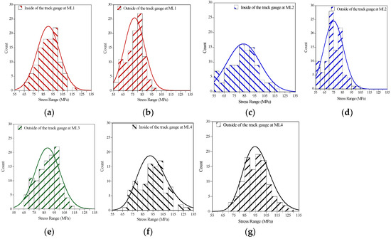 The histograms and PDF plots of the principal stress ranges at the four MLs: (a) the inside track gauge at ML1; (b) the outside track gauge at ML1; (c) the inside track gauge at ML2; (d) the outside track gauge at ML2; (e) the outside track gauge at ML3; (g) the inside track gauge at ML4; (f) the outside track gauge at ML4.