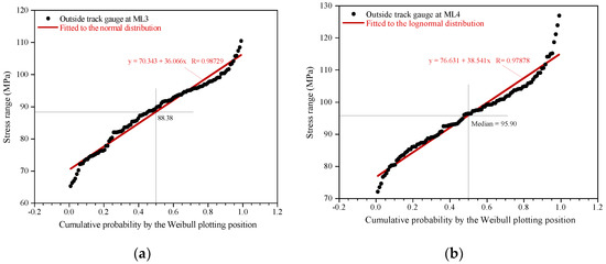 The mean and the coefficient of variation (COV) of the stress range were calculated by applying linear regression to the empirical cumulative distribution function on a probability paper. Figure 6 shows the cumulative probabilities obtained by the Weibull plotting positions, plotted on the normal and lognormal probability papers with centered symbols for the outside track gauges at ML3 and ML4, respectively, as representative cases. The straight line in each figure indicates the fitted normal and lognormal distributions for the stress ranges. The statistical parameters, such as the mean, standard deviation, and COV, of the stress ranges are summarized in Table 2 and the PDFs of the fitted distribution for the four MLs are exhibited in Figure 5. The stress ranges of the inside track gauges are larger than those of the outside track gauges for ML1, ML2, and ML4, as also confirmed by the mean values reported in Table 2. When comparing the stress ranges of the inner and outer rails, similar levels of the stress ranges were measured at ML1 and ML2, whereas that at ML4 was larger than at ML3.