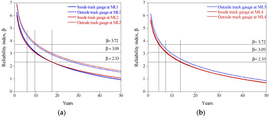 Figure 7a shows the reliability indexes for the inner and outer rails (ML1 and ML3) calculated for similar years in service. The reliability levels for the inside track gauges were always lower than those for the outside track gauges, which implies that the probability of the failure of the tension clamp on the inside rail in direct contact with the wheels of the train is high. Similarly, Figure 7b shows that the reliability index for the inside track gauge at ML4 was slightly smaller than that for the outside track gauge. In addition, the reliability indexes for the inner rail (ML4) were much smaller than those for the outer rail (ML3). These results indicate that the tension clamp on the inner rail has a higher probability of failure than that on the outer rail, which is consistent with the field observations of fatigue damage in the tension clamps.
