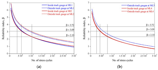 The variations in the reliability index with the accumulated number of stress cycles: (a) ML1 and ML2; (b) ML3 and ML4.