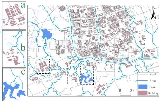 Map and the extracted micro scenes (a) (block composed of roads and buildings), (b) (an urban waterfront composed of buildings and rivers), and (c) (a river system formed by rivers and lakes).