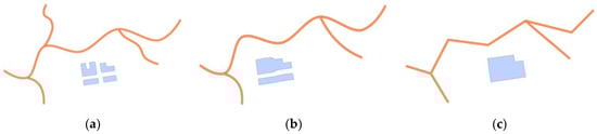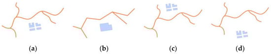 However, this method has certain limitations, such as the four types of double-lines (Figure 6a–d) being converted into straight lines after generalization (Figure 6e). If we use the linear features of generalization or skeleton lines to calculate the geometric similarity, the calculated result will be too large, which is inconsistent with visual perception.