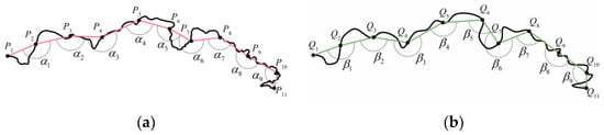 Taking Figure 3 as an example, the black lines are curves P and Q, which are to be compared, and the number of nodes is m and n; P = ((px,1, py,1), (px,2, py,2),…, (px,m, py,m)), Q = ((qx,1, qy,1), (qx,2, qy,2),…, (qx,m, qy,m)). The red line and the green line are the fitted lines, which are composed of a sequence of equal points, and angle sequences (α1, α2 … α9) and (β1, β2 … β9) are obtained.