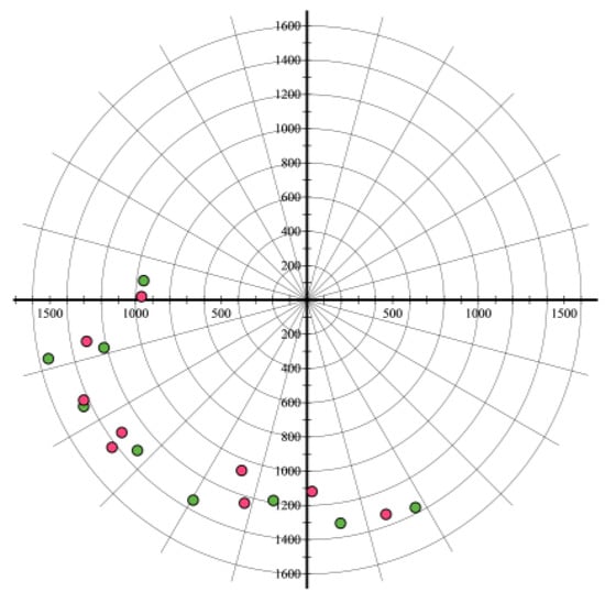 Step 2: The angle sequence and the corresponding length sequence are synthesized to obtain feature sets: M = {(p1, α1), (p2, α2) … (p9, α9)} and N = {(q1, β1), (q2, β2) … (q9, β9)}. Coordinate origin O is taken as the pole, the counterclockwise direction is treated as the positive direction, the length is treated as the polar diameter, and the angle is treated as the polar angle. Then, Equation (5) is used to scatter the points sequence, and the polar coordinate systems (pi, αi) and (qi, βi) are constructed (Figure 4). Finally, according to x = ρcosθ, y = ρsinθ, the polar coordinates are converted into rectangular coordinates, and the feature point sequences of the curves are converted into description sequences of geometric features.