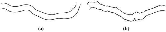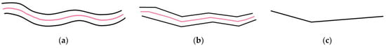 The method of a constructing skeleton line can describe the shape features of a simple double line to some extent []. In Figure 5, the black lines are the curves to be compared and the red lines are the extracted skeleton lines. Shape recognition and element matching can be performed by comparing the geometric features between the skeleton lines.