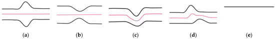 Several types of double lines: (a) convex symmetry; (b) concave symmetry; (c) curvature difference; (d) misplaced; (e) final generalized result.