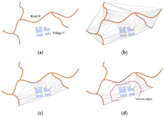 - Generate the Voronoi diagram. If the three vertices of a triangle belong to the same object group, it is called the first type of triangle; otherwise, it is called the second type of triangle (Figure 9b).