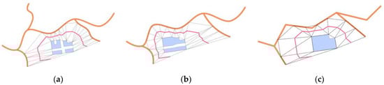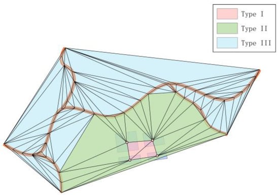 Generally, the position similarity is obtained by calculating the center distance between objects, where position graphs and Delaunay triangulation are commonly used methods [,]. Micro scenes contain lines and polygons, and the positional relationship between features needs to be described separately. Delaunay triangulation has been widely used in the description of spatial relations and it meets the above requirements. We selected Figure 10a as an example; three types of triangles describing position relationships were obtained through the construction of Delaunay triangulation (Figure 13).