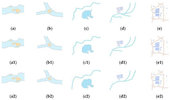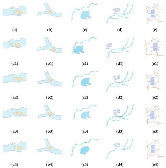 Original data and generalization data: (a–e) the original data; (a1–e1) the data after the displacement operation; (a2–e2) the data after the simplify operation; (a3–e3) the data after the merge operation; and (a4–e4) the data after the delete operation.