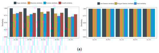 According to the calculation results of the proposed method, we found that the position similarity of the five micro scenes was relatively low, and the direction and shape similarities were high (Figure 16c). The Fourier calculation results showed that the similarity of line features did not change, but the similarity of polygon features changed considerably. The above results showed that the two methods are complementary under the merge operation.
