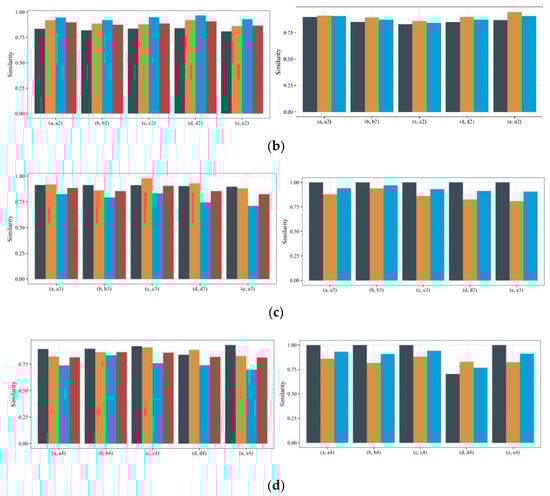 The main purpose of this part of the study was to verify the effectiveness of applying geometric similarity to assessing the quality of micro scene generalization. We chose Figure 17a–e as the original data, and small-scale maps were generated on this basis. The similarities between each micro scene were computed, and the experimental results are shown in Table 2 and Table 3.