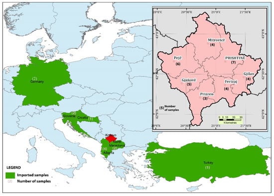 In total, 45 samples, both locally produced and imported samples, were protected from light at room temperature. The analyses of moisture, pH, electric conductivity, free acidity, HMF, proteins, soluble solid content, and ash were performed between October 2020 and March 2021 at the Kosovo Agricultural Institute in Peja and at the laboratory of the Faculty of Agriculture and Food Sciences in Sarajevo in Bosnia and Herzegovina. Figure 1 shows the geographical origin of the studied Kosovo’s and imported honey samples studied.