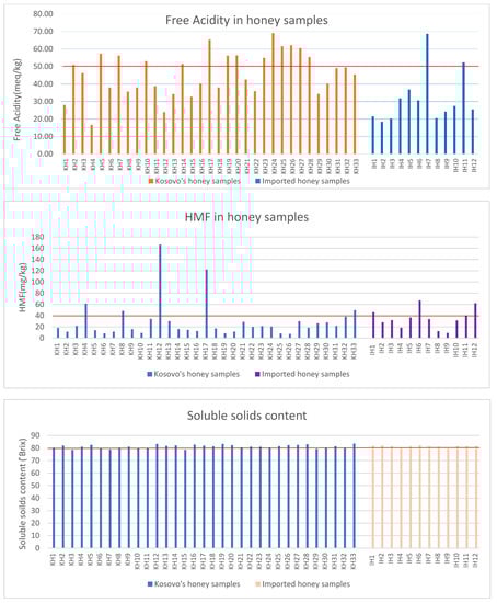A summary of the results of the acidity, HMF, and soluble solids of local and imported honey is presented in Figure 2. The results presented in the figure show the increased values of free acidity, HMF, and low soluble solid contents.
