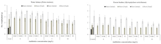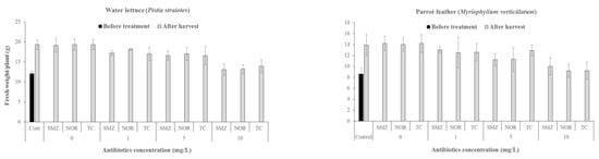 The objective of this study was to identify water plant species capable of efficient removal of antibiotics from aquatic environments without adverse effects on their growth and morphology. During the 30-day experimental period using 1–5 ppm treatment concentrations, we noticed no visible signs of detrimental effects or yellow leaves in either species. The growth of plants in the hydroponic culture solution was good, as demonstrated by significantly greater biomass yield at the end than at the beginning of the experiment (Figure 1). By the 10th day of the experiment, the containers were completely covered by plants. However, at 10 ppm treatment concentrations, plant growth was inhibited by 40–50%. In particular, we observed chlorosis and early abscission of leaves. Neither water lettuce nor parrot feather plants showed difference in fresh plant weight according to type of antibiotic used. The fresh weight of plants decreased in a concentration-dependent manner as antibiotic concentration increased (Figure 2).