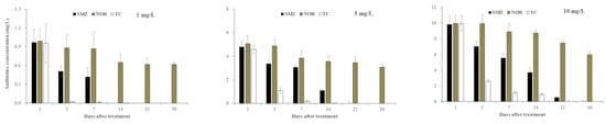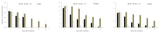 Antibiotic concentrations in hydroponic culture solution under various treatment concentrations during the experiment period are shown in Figure 3 and Figure 4. In water lettuce plants, SMZ and TC were lower than the limit of detection in aqueous solution from 21 days after treatment. However, 60% of the treated amount of NOR remained in aqueous solution. The water solubilities of treated antibiotics were SMZ 1500 mg /L H2O (25 °C), TC 231 mg/L H2O (25 °C), and NOR 0.28 mg/mL H2O (25 °C). The high residual amount of NOR in aqueous solution is presumably due to water solubility. It was previously reported that absorption, abiotic transformation, and biotic transformation are major processes that antibiotics undergo in aquatic environments []. Hydrolysis and biodegradation also comprise an important degradation pathway for organic pollutants in aquatic ecosystem. In the present study, treated water plants showed greater removal efficiency of antibiotics compared with the control group (data not shown). We conclude that water plants play an important role in reduction in antibiotic contamination in aquatic environments, especially SMZ and TC. Parrot feather plants showed similar trends to water lettuce plants.