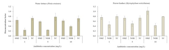 To evaluate the abilities of the two water plant species to extract and accumulate antibiotics into plant tissues, the bioconcentration factor (BCF) was determined for roots, according to the method described by Zayed et al. [], as follows: